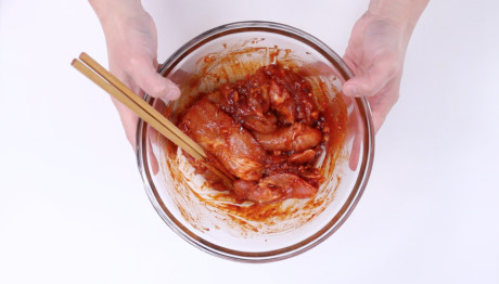 Làm sốt ướp bằng cách trộn đều tương ớt, dấm gạo, mật ong, tỏi băm, muối và tiêu trong một chiếc tô lớn.