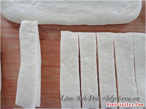 Bước 5: Lấy khăn phủ lên miếng bột để 15 phút cho bột nở lại 1 chút. Rồi cắt miếng dài to bảng. Sau đó lấy 2 miếng bột chồng lên nhau.