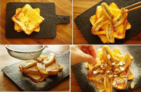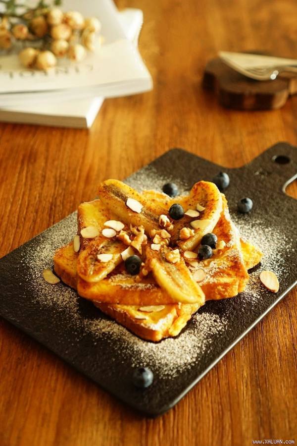Gắp bánh mì ra đĩa, xếp chuối chiên lên trên, rây đường bột và rắc bột quế, hạnh nhân lên trên là xong.