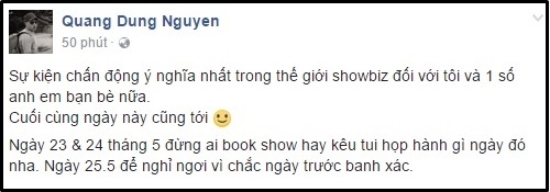 Mới đây, đạo diễn Quang Dũng bất ngờ đăng tải một dòng trạng thái lên trang cá nhân. Theo đạo diễn Nguyễn Quang Dũng, vào ngày 23-24/5 tới đây "đừng ai book show hay kêu họp hành gì. Ngày 25/5 để nghỉ ngơi vì ngày trước banh xác".