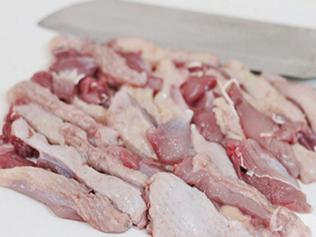 Tiếp tục rửa vịt bằng rượu trắng hoặc gừng để vịt hết mùi hôi, chặt vịt theo từng miếng thon dài vừa phải.