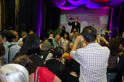 Nhạc sĩ Lam Phương trong vòng tay của người hâm mộ, ai cũng muốn có được tấm hình lưu niệm với ông. (Băng Huyền/ Viễn Đông)