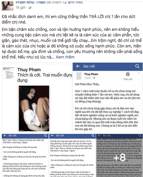 Phan Như Thảo còn nặng lời khi viết: "Hôn nhân của chị và chồng em đã kết thúc hợp pháp từ rất lâu rồi. Chị cũng xài lại đồ của nguời khác và đã thất bại trong cuộc hôn nhân đó nên chị không có tư cách dạy dỗ em cách làm vợ anh ấy như thế nào. Việc em là bà 4 hay bà 2 cũng không muợn chị phải bận lòng suy nghĩ và phát ngôn hộ em.. Khi nào cần, em tự biết lên tiếng".