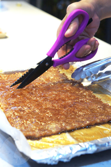 Dùng kẹp thực phẩm và kéo để cắt thịt thành từng miếng với kích thước bạn muốn.