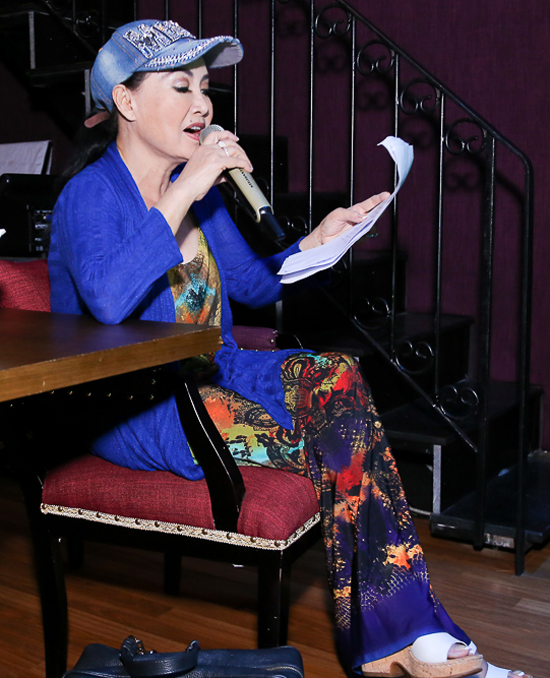 Ca sĩ hải ngoại Thanh Lan dù đă 69 tuổi nhưng vẫn mặc đồ trẻ trung đến tập nhạc.