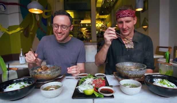 Sonny cùng bạn đồng hành thử suất phở 100 USD. Ảnh: YouTube.