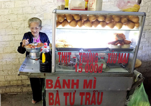 Với nhiều người dân Sài Gòn, bánh mì của bà Tư Trầu (nằm ở góc ngã Tư Lê Văn Sĩ - Trần Quang Diệu, quận 3, TP.HCM) đã trở thành một món ăn quen thuộc mà lâu lâu không ăn sẽ thấy nhớ. Gần 60 năm nay, cuộc đời của bà Tư Trầu với nghiệp bán bánh mì. Bánh mì của bà với phần nhân xíu mại có hương vị độc quyền mà chẳng nơi nào có được.