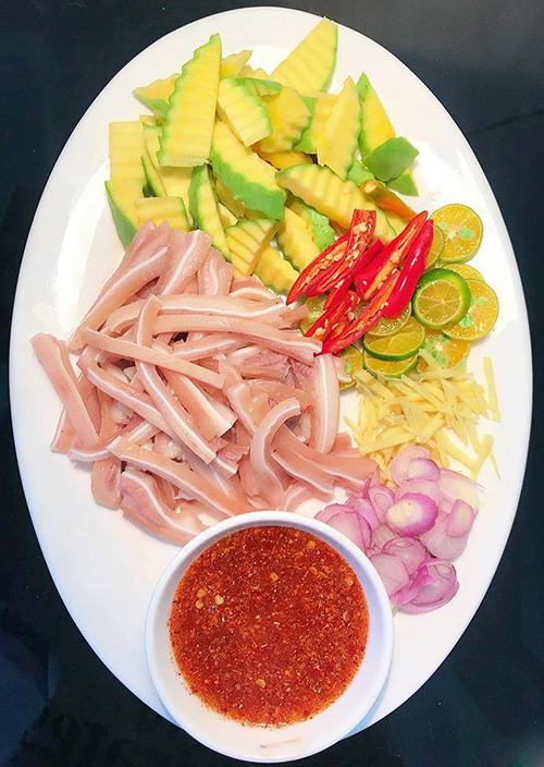 - Cho hỗn hợp đã pha trộn cùng tô đựng tai lợn, xoài xanh…trộn đều trước khi ăn 1-2 tiếng.