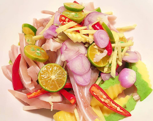 - Tai chín vớt ra ngâm vào nước lọc có đá lạnh pha nước cốt chanh. Sau 15 phút vớt ra để ráo rồi thái dày khoảng 0,5 cm. Xoài xanh thái miếng nhỏ dày vừa, ớt thái sợi (có ớt xanh càng đẹp), hành khô thái mỏng, gừng thái chỉ, quất (tắc) vài trái thái mỏng. Cho tất cả vào một cái tô lớn.