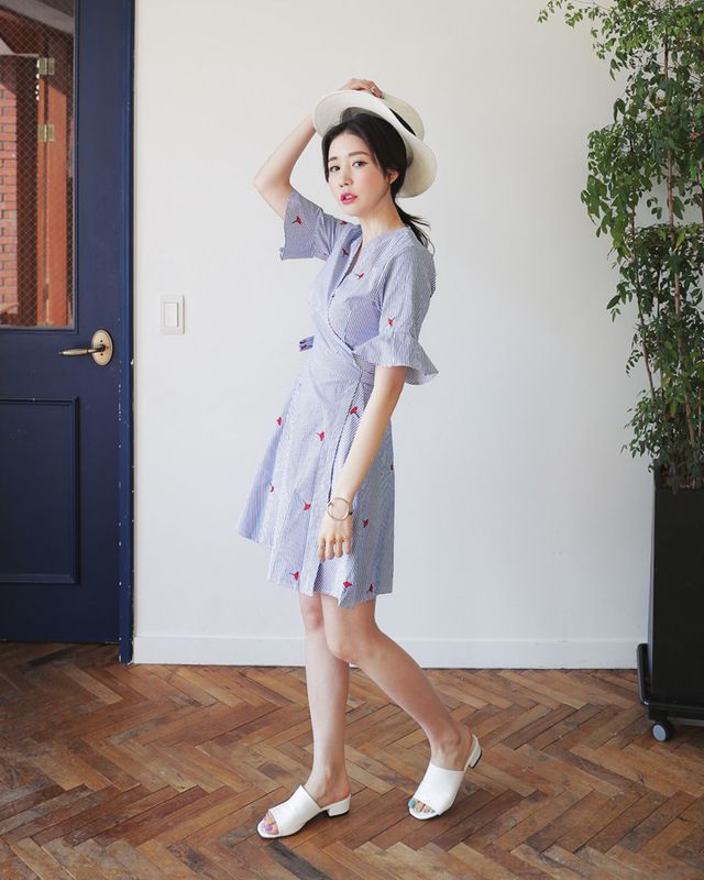 Nếu muốn thêm một chút nữ tính, bạn có thể diện cho mình đôi dép lê đế thô màu trắng rồi phối nó xuyệt tông với trang phục như đầm kẻ sọc vạt chéo.