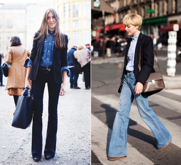 Sự kết hợp giữa quần jean ống loe và chiếc áo khoác dạ dáng dài sẽ là cặp đôi thời trang vô cùng sành điệu và thời thượng, mang lại cái nhìn cổ điển của những thập niên 90 đã qua. Tuy nhiên, cách mix này chỉ phù hợp với những cô nàng có thân hình mảnh mai, hạt dẻ hơn là các cô gái mũm mĩm và thích hợp để ứng dụng vào mùa thời trang thu đông. Nếu bạn là tín đồ của phong cách thời trang Hippie tự do và phóng khoáng thì bộ đôi này sẽ là lựa chọn tuyệt vời mang hơi hướng Vintage một chút. Một gợi ý thú vị nữa, các bạn có thể nhấn nhá thêm một chiếc túi đeo bản nhỏ để thể hiện vẻ đẹp hiện đại của những năm đầu thế kỷ 20.