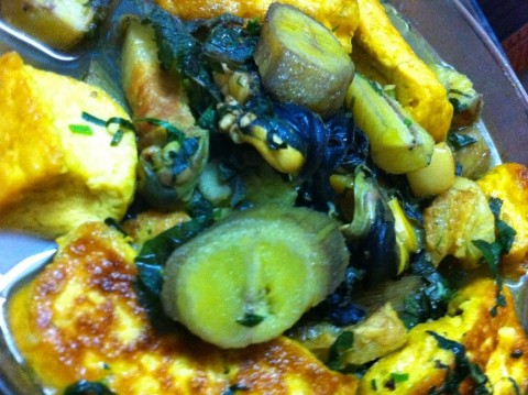 Bước 3: Cho thịt đã xào chín ở trên vào chảo, sau đó cho cà chua, chuối vào xào cùng, nêm thêm gia vị cho vừa miệng, sau đó cho nước mẻ lọc trộn cùng mắm tôm và nước nghệ tươi vào, thêm chút nước cho xâm xấp thịt và chuối. Sau đó đun sôi lên rồi vặn nhỏ lửa, cho đến khi thịt và chuối chín mềm thì bạn cho đậu rán vào đun một lúc, sau đó mới cho ốc vào, nêm thêm gia vị cho vừa miệng, sau đó bạn đun sôi trở lại rồi cho tía tô, lá lốt, hành lá thái nhỏ vào, dùng đũa trộn đều lên và tắt bếp.