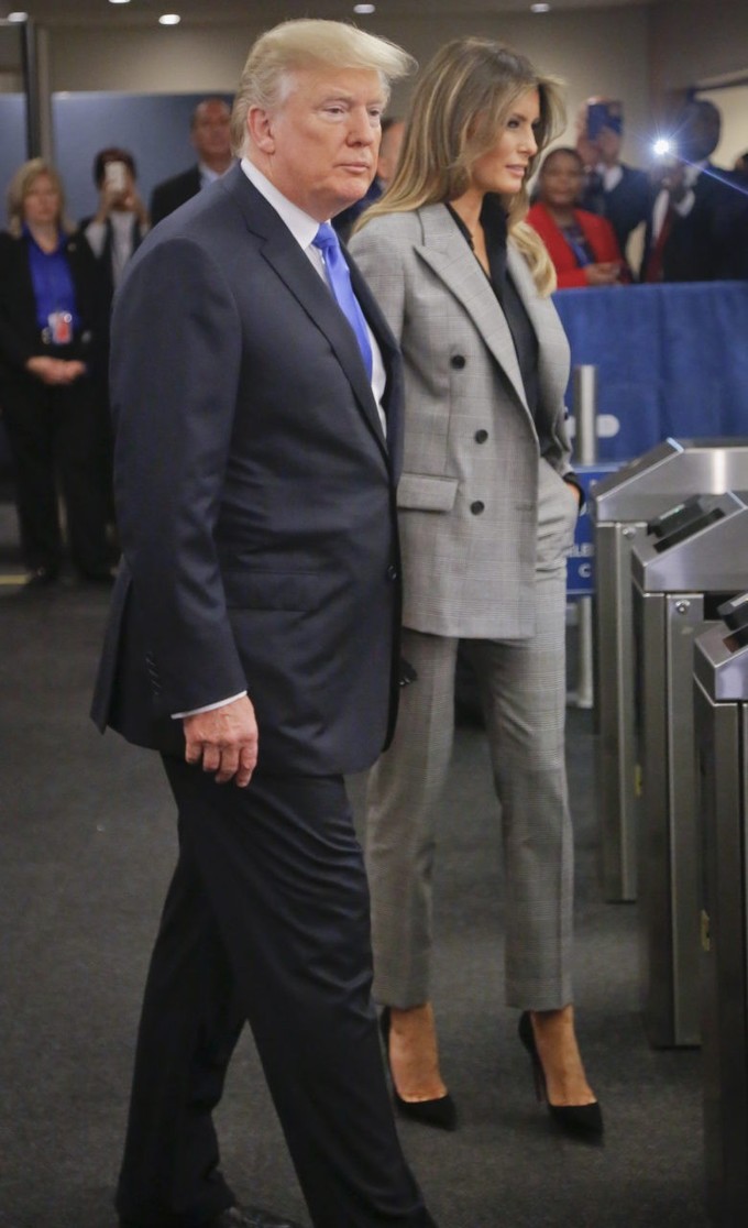 Với vóc dáng và thần thái của một cựu người mẫu, bà Melania toát lên vẻ sang trọng, quyền lực khi diện suit màu ghi giá 1.995 USD (khoảng 45 triệu đồng) của hãng Calvin Klein. Trang phục được kết hợp cùng giày và áo sơ mi đen.