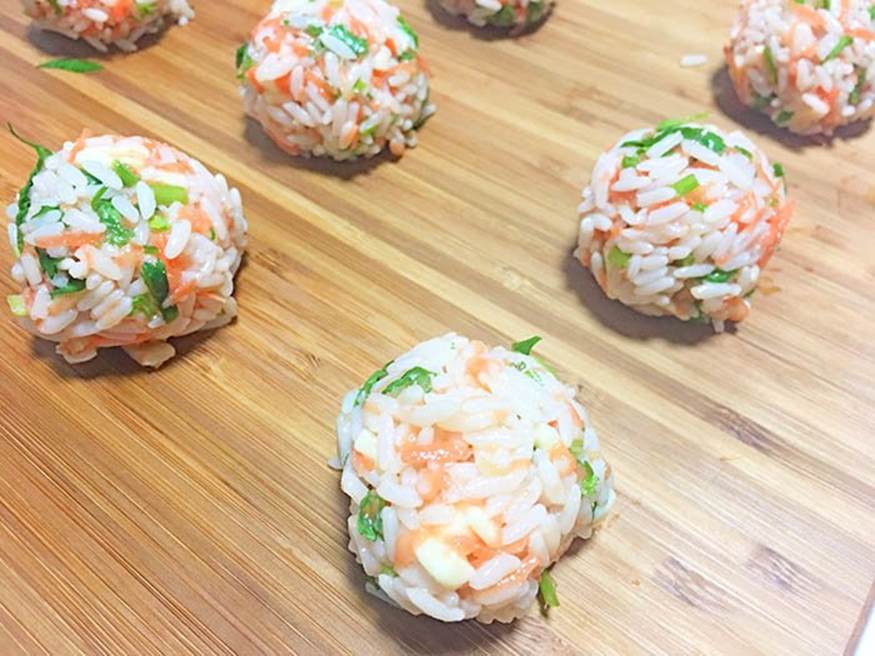 Nặn hỗn hợp cơm thành những viên tròn nhỏ có đường kính khoảng 3cm.