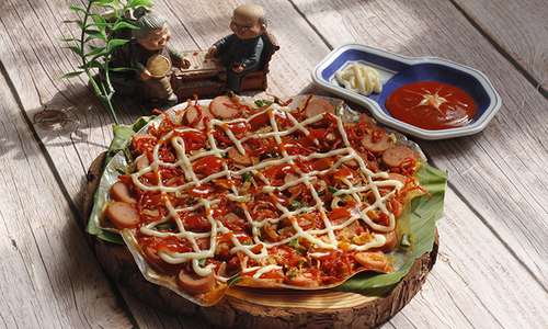 Vỏ bánh giòn rụm, nóng hổi, đa dạng màu sắc: màu vàng của trứng, màu đỏ của bò khô, hồng của xúc xích, xanh hành lá… rất hấp dẫn.