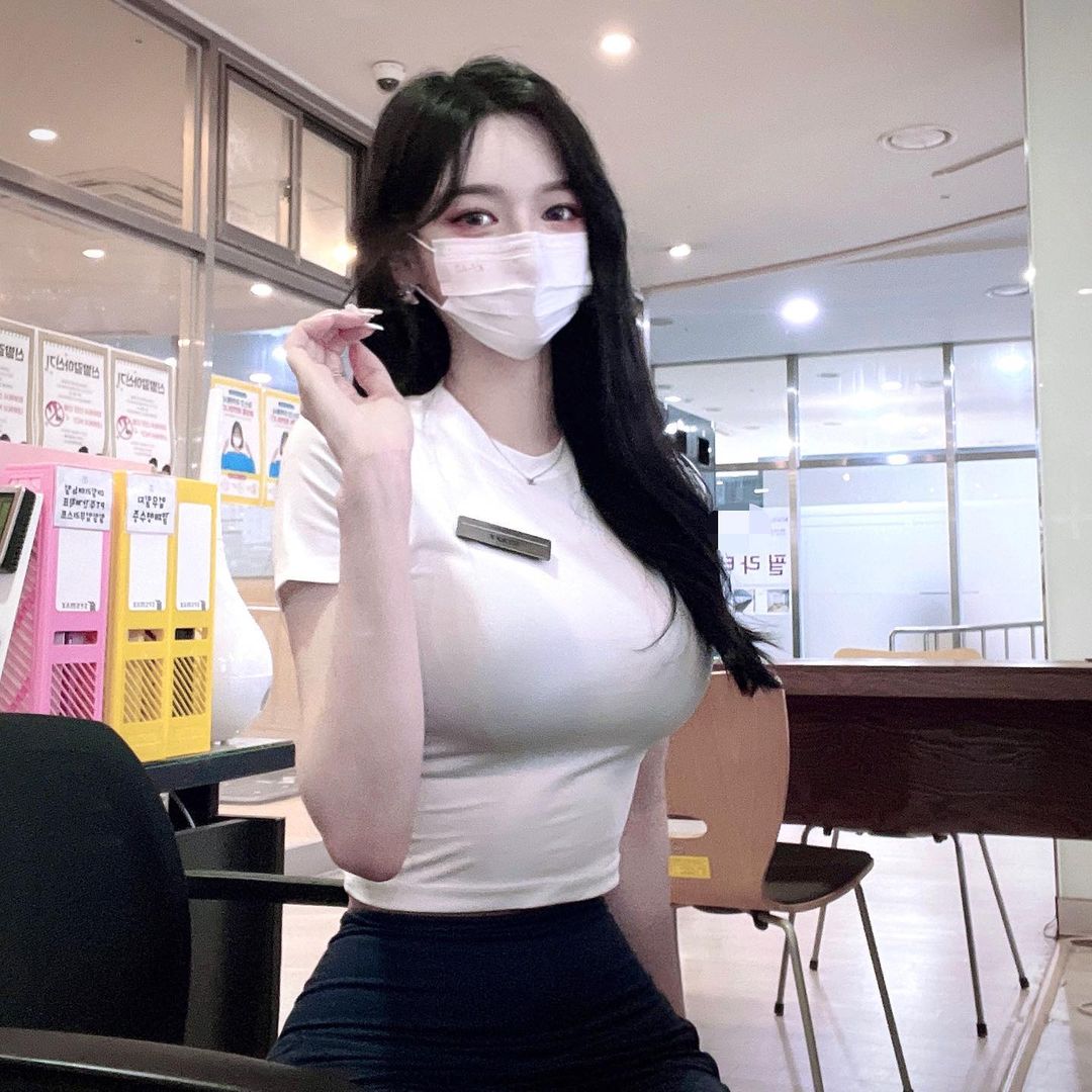 Mới đây, h́nh ảnh của cô gái Hàn Quốc trong chiếc áo thun bó được đăng tải nhiều trên mạng xă hội với lời ngợi khen cô nhân viên quyến rũ. Người đẹp chọn diện thiết kế áo ôm đơn giản màu trắng khéo tôn được lợi thế ṿng 1.