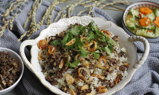 Món xôi áp dụng đồ 2 lửa với hạt xôi căng bóng quyện thịt chim câu béo bùi, rắc chút hành phi giòn rụm khiến ai cũng khó chối từ.