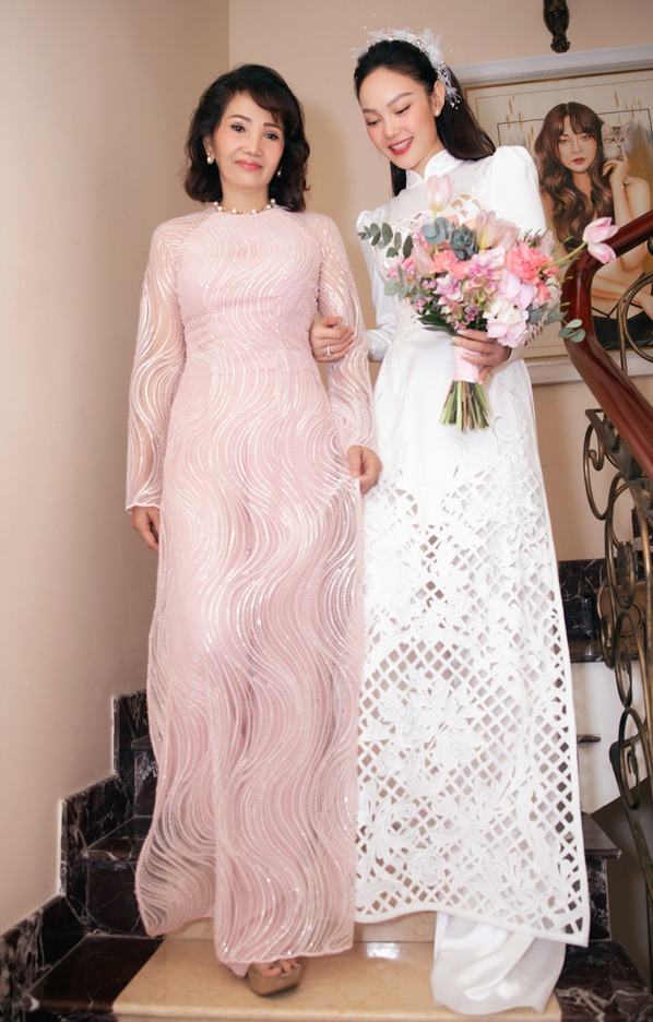 Minh Hằng diện áo dài cưới của Chung Thanh Phong, được mẹ ruột dẫn ra mắt họ hàng hai bên tại lễ gia tiên sáng 13/6. Ảnh: KiengCan team