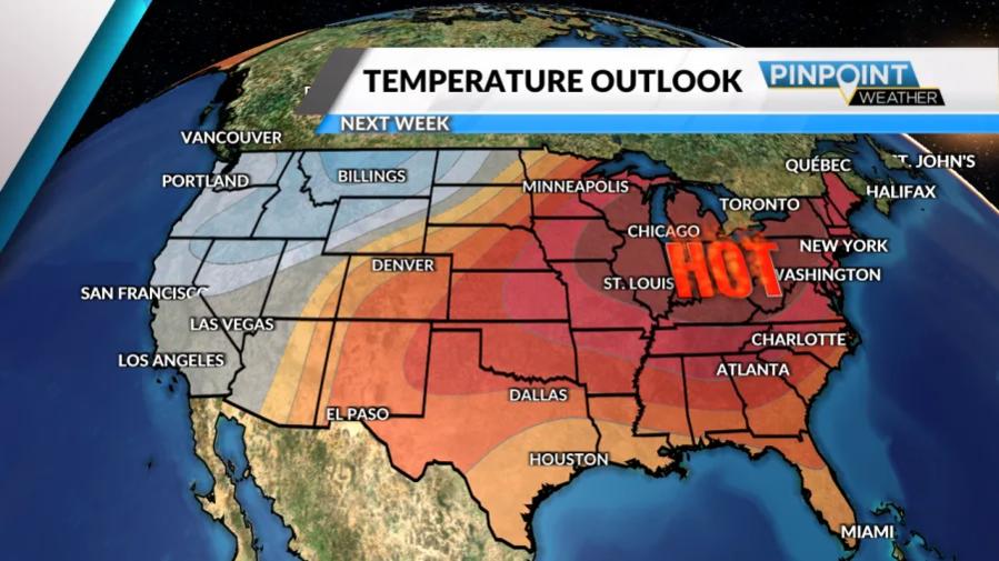 Sóng nhiệt dữ dội sẽ không dừng lại ở đó. Một mái vòm nhiệt đang mở rộng và đặc biệt sẽ mạnh hơn được hình thành ra vào Chủ nhật trên khắp miền Đông và kéo dài đến Trung Tây và Ngũ Đại Hồ trong vài ngày sắp tới, với sức nóng cao dự kiến sẽ kéo dài trong suốt cả tuần.