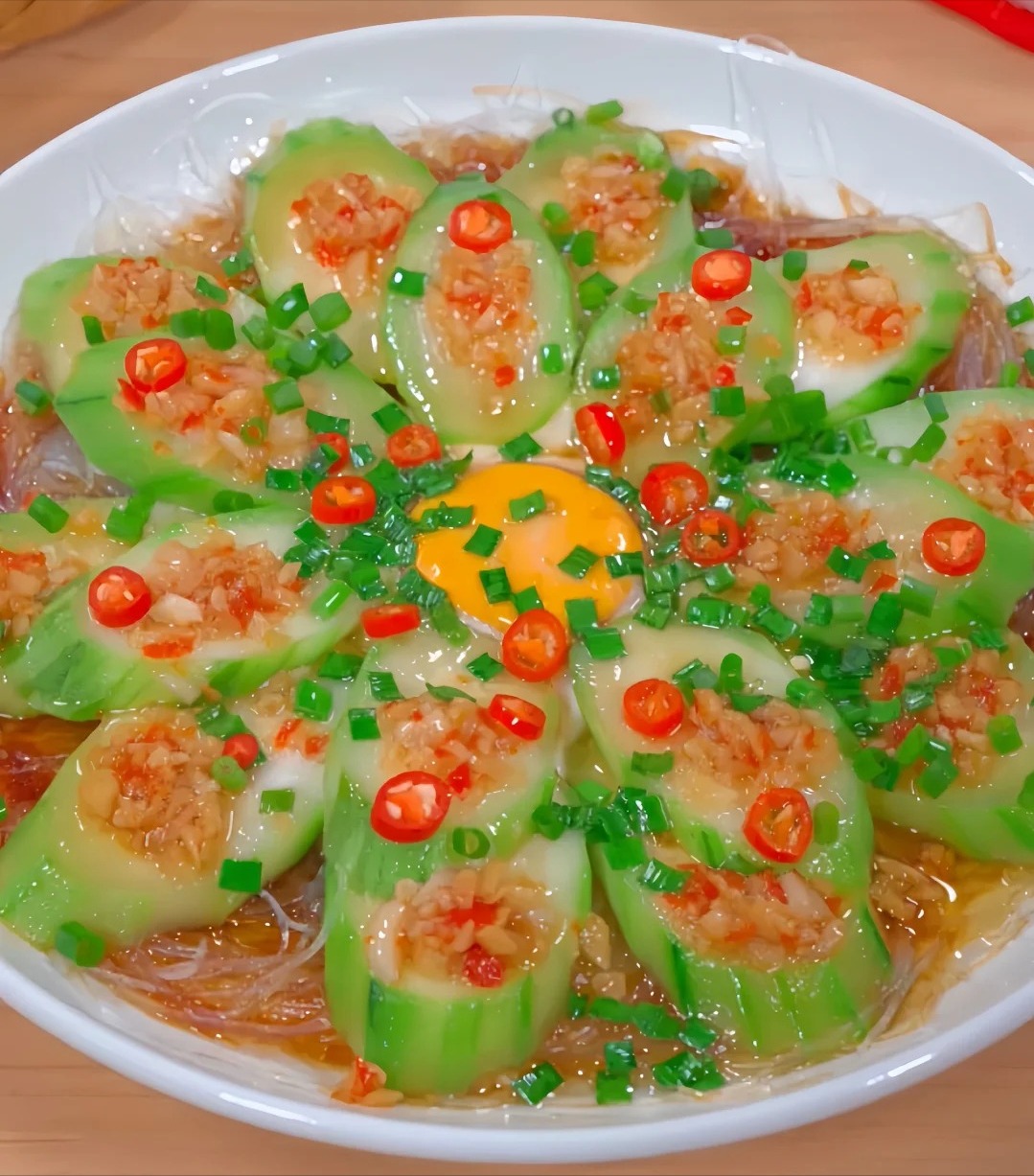 - Bún khô ngâm mềm. Vớt mướp ra để ráo nước, sau đó đặt các lát mướp đã rửa sạch lên trên bún.