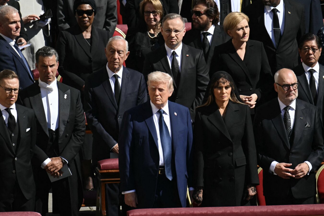 Hôm Thứ Bảy, 26 Tháng Tư, ở tang lễ Đức Giáo Hoàng Francis trên quảng trường St. Peter tại Vatican, Tổng Thống Trump đứng chung với một loạt nhà lãnh đạo thế giới khác, như Tổng Thống Emmanuel Macron của Pháp, Thủ Tướng Keir Starmer của Anh, Tổng Thống Javier Milei của Argentina, và Thủ Tướng Giorgia Meloni của Ý. Tất cả những vị đó đều mặc đồ đen.