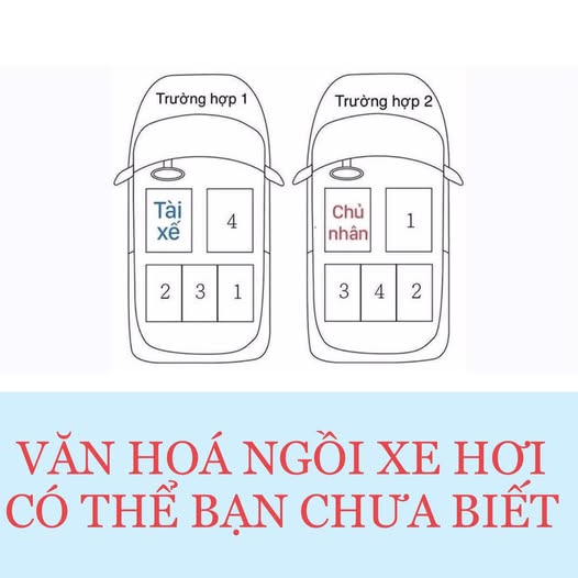 - Trường hợp 2, chủ xe tự lái: Chỉ có 2 người thì lên ghế phụ trước ngồi. Có từ 3 người trở lên trên xe thì người có ngôi thứ cao nhất hoặc vợ/chồng lên ngồi trước với chủ xe.