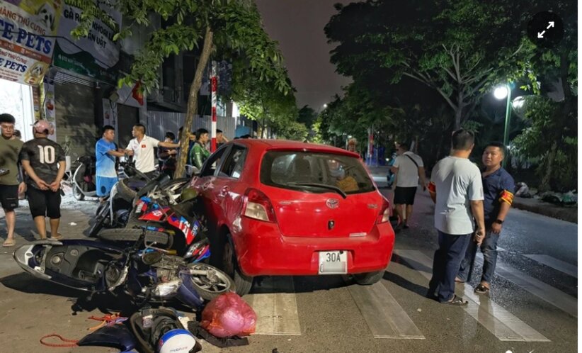 Tại hiện trường, phần đầu ôtô bị hư hỏng nặng, nhiều xe máy nằm la liệt trên đường và vỉa hè, có xe bị bung yên, biến dạng. Cú va chạm mạnh khiến 3 người bị thương, trong đó 2 người được đưa vào cấp cứu tại bệnh viện.