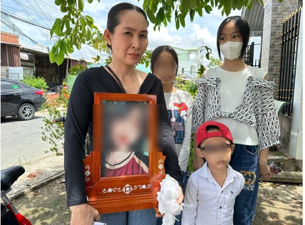 Bà Hiền cầm di ảnh Trân và 3 con (em của Trân) sau buổi làm việc với Cơ quan điều tra VKSND Tối cao. Ảnh: H.X