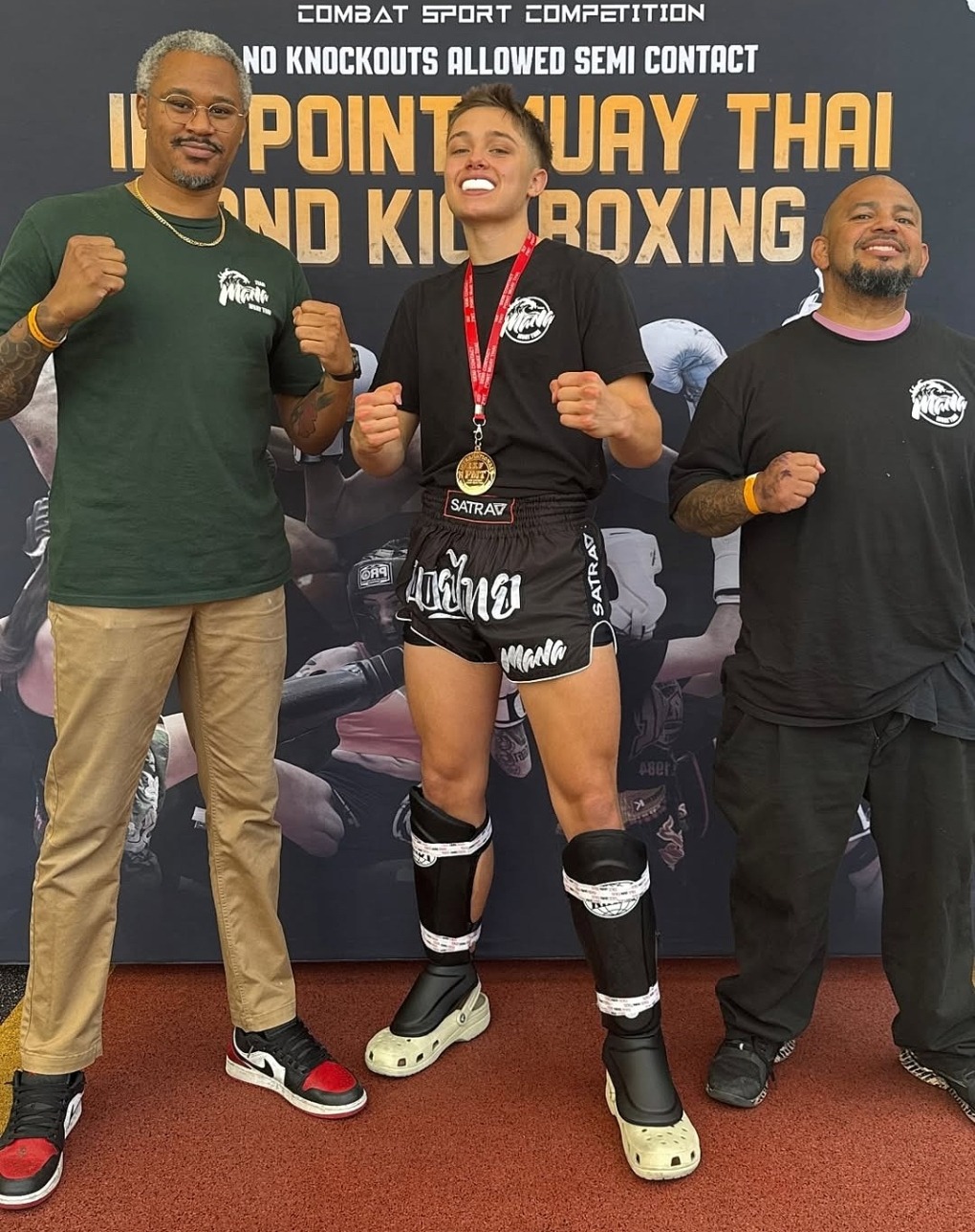 Knox Jolie-Pitt (giữa) trong trang phục thi đấu. Ảnh: Instagram teammanamuaythai
