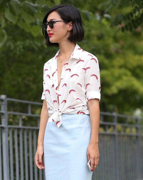 Cách dễ dàng nhất để tạo điểm nhấn cho vòng eo mà không cần sử dụng đến thắt lưng là thắt nút cho cho chiếc áo thun hay áo sơ mi. Đây cũng là cách giúp bạn tạo được sự phá cách cho những chiếc áo kiểu dáng đơn giản.