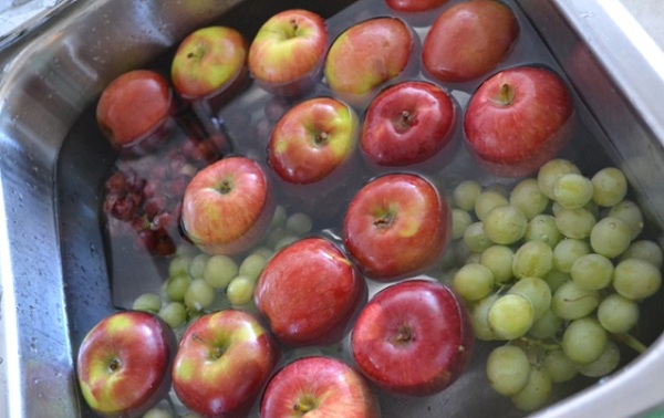 Trái cây và rau củ cần được ngâm trong hỗn hợp trong 10-20 phút và sau đó rửa sạch với nước. Hoặc bạn có thể đổ chất lỏng vào chai với vòi phun và phun lên trái cây và rau củ. Hãy để chúng trong 10 phút và sau đó rửa sạch lại bằng nước.