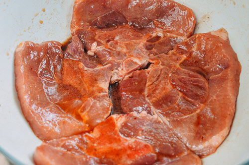 - 4 miếng thịt vai (loại có kèm chút xươn) có độ dày khoảng 2cm, rửa sạch, lau khô