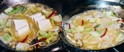 Khi giá đỗ hơi mềm thì đổ thêm nước vào lấp sấp. Tiếp đó cho đậu hũ và cải thảo vào. Cuối cùng bạn cho phi lê cá và bột bắp. Khi cá chín, súp sôi và có độ sệt nhẹ là được.