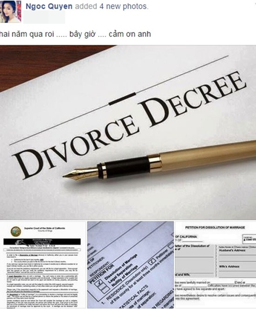 Mấy ngày qua, người hâm mộ cảm thấy hoang mang khi trên Facebook của Ngọc Quyên có xuất hiện hình ảnh lá đơn li hôn và những dòng tâm trạng đầy ẩn ý của cô. Mặc dù trạng thái này đã được cô gỡ khỏi trang cá nhân nhưng dư luận vẫn “bán tín ban nghi” về chuyện này. Ngọc Quyên đã chính thức lên tiếng để giải tỏa những nghi ngờ của dư luận.