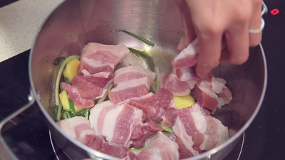 Sau khi rang thịt, hành và gừng rang chung đều được loại bỏ ra ngoài, bạn chỉ giữ lại phần thịt rồi đổ vào nồi trở lại.