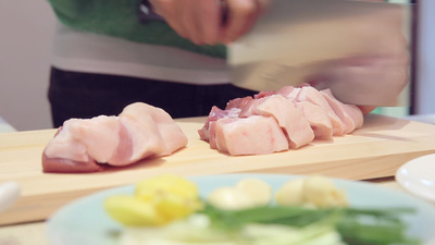 Trút thịt lợn vào đảo chung chừng 5 phút hoặc cho đến khi thịt săn lại, ngả màu vàng nâu.
