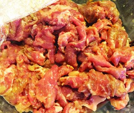 -Nạc vai rửa sạch, cắt mỏng, trộn các gia vị như: 4 muỗng canh nước mắm ngon, nửa muỗng cà phê canh bột ngọt + 2 muỗng canh dầu hào + 1 muỗng cà phê tiêu xay+ nửa lon nước dừa Coco + sữa đặc có đường + xả + 1 muỗng canh dầu ăn + 2 muỗng canh đường vàng. Trộn đều tất cả lại, cho vào tủ lạnh từ 4 đến 5 tiếng hoặc có thể ướp qua đêm.