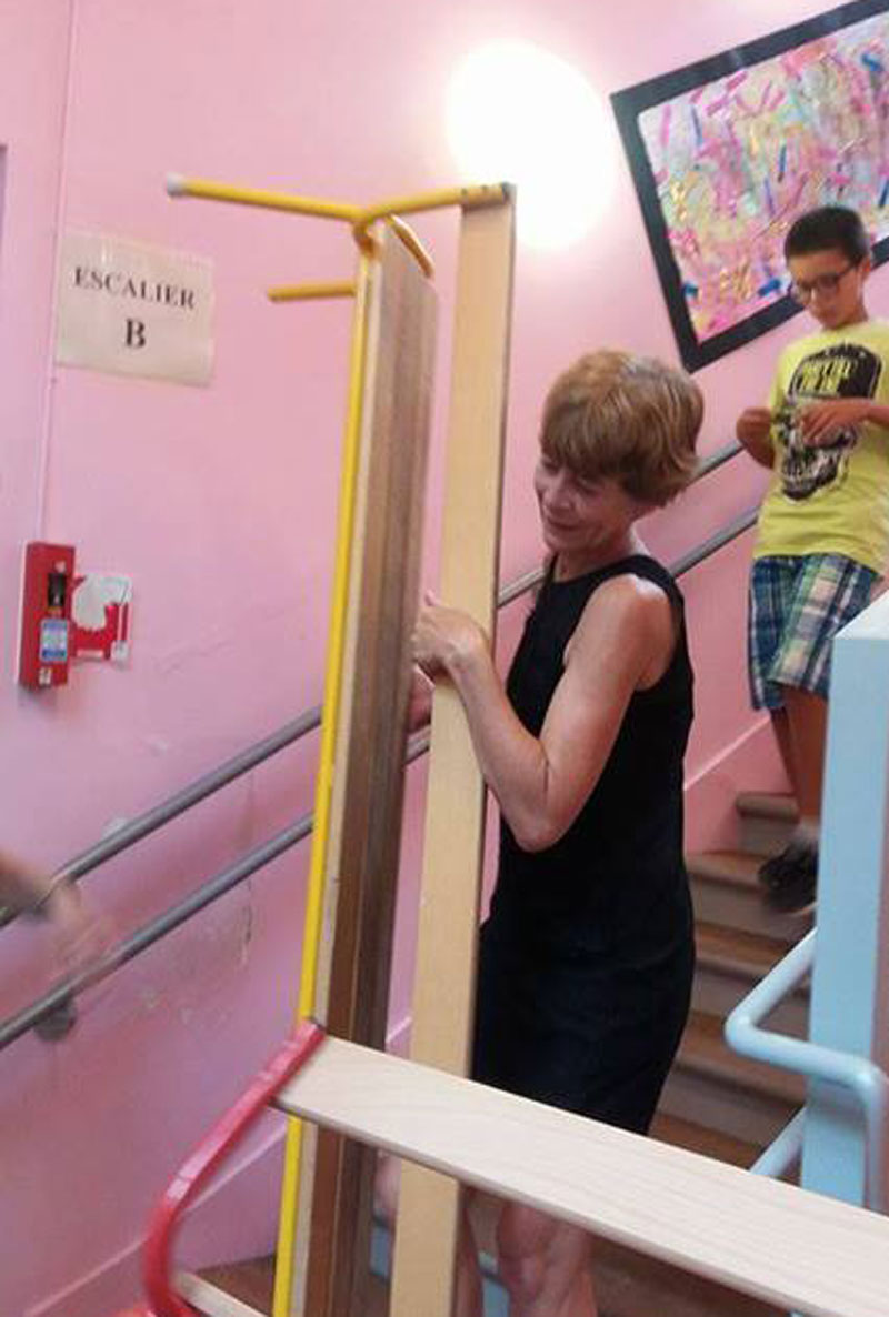 Cô Hiệu trưởng khuân ghế xuống cho lớp mẫu giáo bé.