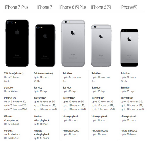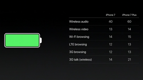Cụ thể, iPhone 7 cho thời gian đàm thoại liên tục 14 giờ (với 3G), bằng với iPhone 6s và iPhone SE, trong khi iPhone 7 Plus thậm chí còn thua iPhone 6s Plus (21 giờ so với 24 giờ). Thời gian chờ của iPhone 7 cũng chỉ 10 ngày và bằng các thế hệ cũ, riêng iPhone 7 Plus và iPhone 6s Plus đều 16 ngày.