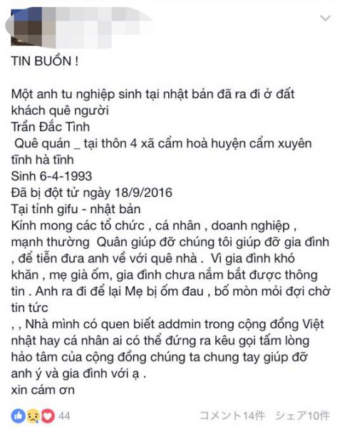 Không lâu trước đây, dư luận đã xót xa với một trường hợp du học sinh Việt tử vong tại Nhật Bản. Mới đây, lại thêm một học sinh xấu số bỏ mạng ở đất nước xa xôi này. Gia đình cậu đang hết sức kêu gọi sự giúp đỡ để đưa thi thể cậu về nước.