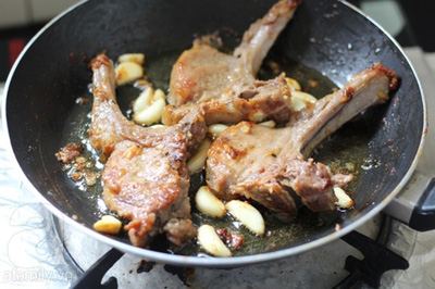 Tiếp đến cho từng miếng thịt cốt lết vào chiên đều 2 mặt trên lửa nhỏ.