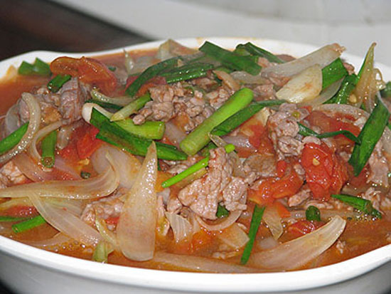 Bước 7: Cuối cùng các bạn đổ thịt bò vào chảo đảo đều với cà chua và ngấm gia vị. Tắt bếp và cho hành lá vào trộn đều. Để món ăn thêm hấp dẫn các bạn rắc thêm chút hạt tiêu lên đĩa thịt bò xào cà chua nhé.