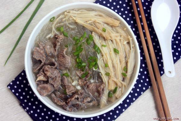 Bước 4: Cho miến bò nấm ra tô, thêm chút hành lá vào là xong.