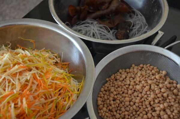 - Đổ nấm mèo, nấm hương, và miến vào xào cùng cho vừa chín tới. Ccuối cùng cho rau củ, giá đỗ vào xào sơ cho thêm một ít muối.