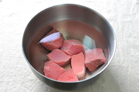 Ḅ rửa sạch cắt khúc dài 5cm. Ngâm thịt ḅ trong nước lạnh khoảng 30 phút.