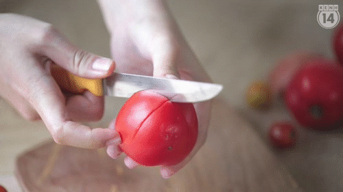 - Cà chua rửa sạch, cắt ngang phần đầu quả để bỏ cuống. Khứa nhẹ hình chữ thập dưới mỗi đáy quả cà chua.
