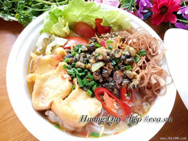 Bún ốc rất thơm ngon với nhiều gia vị hấp dẫn. Ốc giòn sần sật, nước dùng chua chua, thêm rau chuối, đậu phụ, ớt bột chưng... Chào ôi, thèm quá!