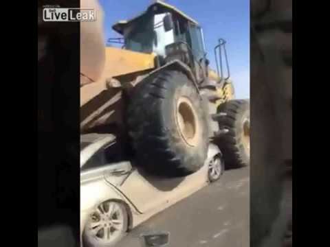 Một vụ tai nạn khá hi hữu đã xảy ra trên đường cao tốc giữa xe con và xe xúc. Chiếc xe xúc lao khá nhanh và lấn sang phần đường của xe con. Chiếc xe con do không tránh được nên đã đứng lại bấm còi, tuy nhiên chiếc xe xúc không nhìn thấy xe con và va chạm.