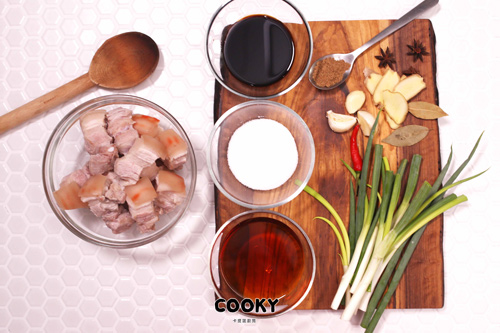 - Cho thịt ba chỉ vào, thêm nước tương, rượu gia vị, ngũ vị hương, lá nguyệt quế, gừng, đại hồi, tỏi, ớt, hành lá và 300ml nước vào nồi.