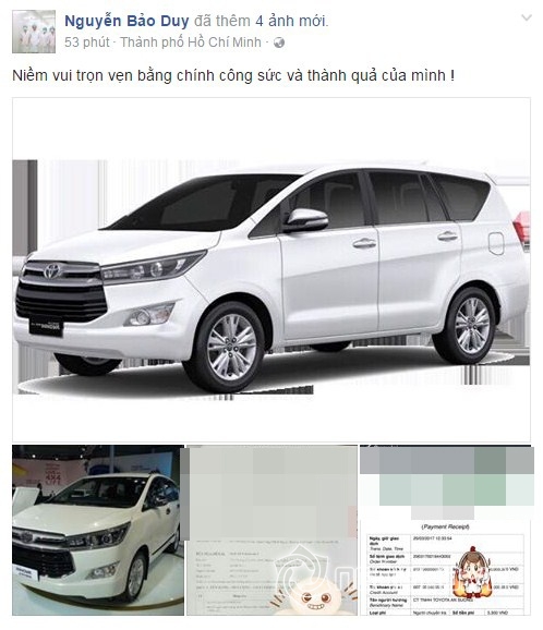 Mới đây, chồng cũ của Phi Thanh Vân đã tậu được xế hộp chỉ sau một thời gian ngắn thành lập công ty. Bảo Duy đăng tải hình ảnh chiếc xe innova G màu trắng 2017, 8 chỗ ngồi cùng lời chia sẻ: “Niềm vui trọn vẹn bằng chính công sức và thành quả của mình!”.